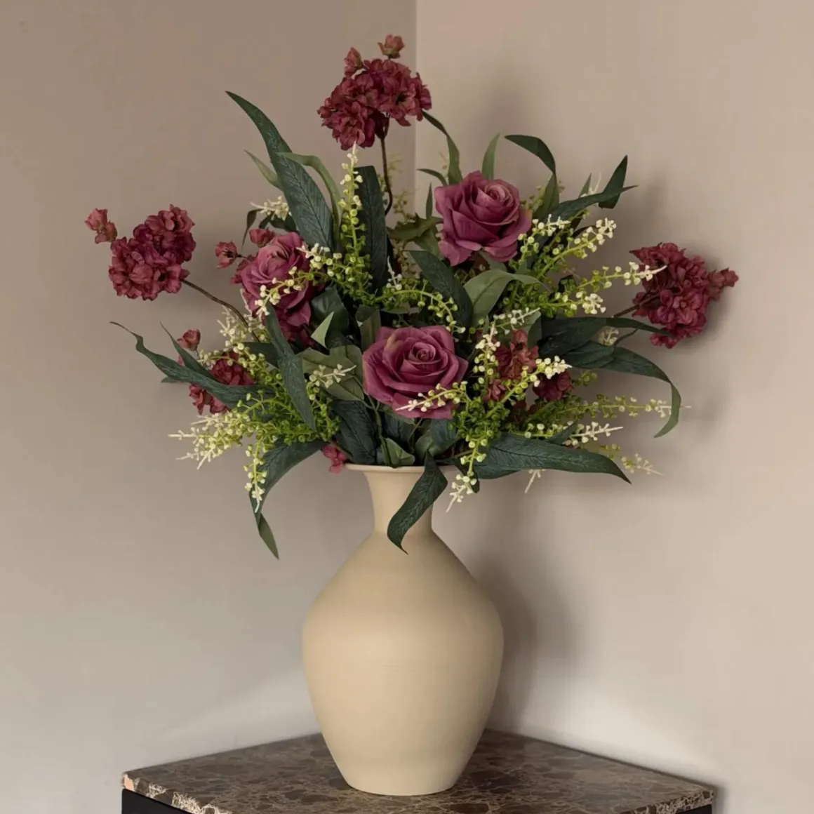 Prachtige beige vaas met een zijden bloemen boeket in aubergine tinten. Perfect op een salontafel bijvoorbeeld.