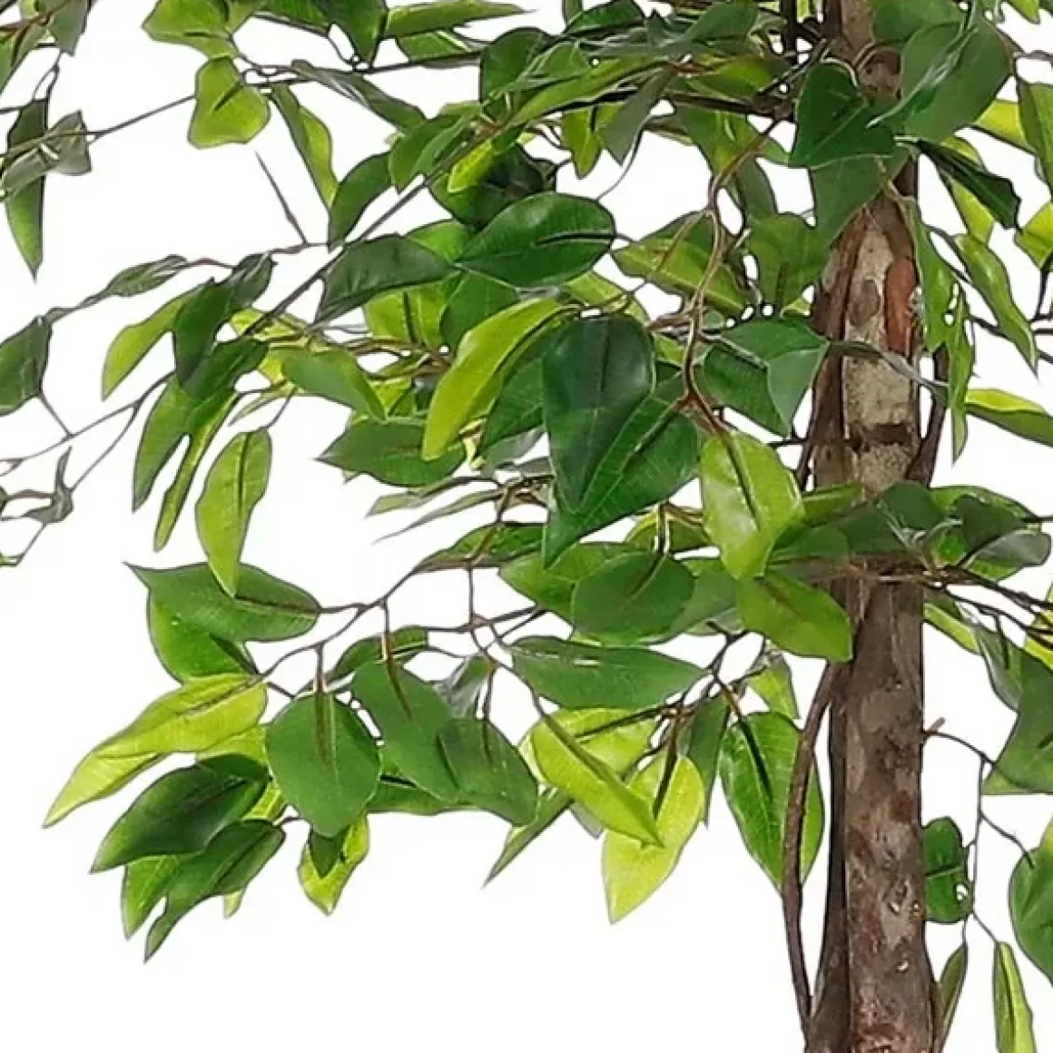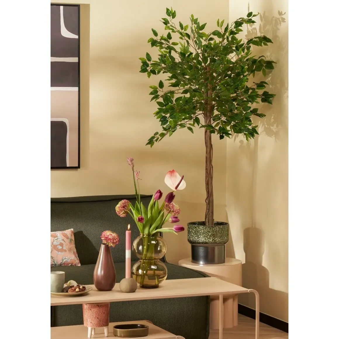 Deze prachtige ficus kunstplant van Mica Decorations is maar liefst zo’n 150 cm hoog en heeft een diameter van ongeveer 50 cm. De gevlochten stammen en effen groene bladeren zijn bijna niet van echt te onderscheiden. De zijtakken en speels aangebrachte kleine bladeren bevinden zich als een bol aan het bovenste deel van de struik waardoor hij meer weg heeft van een kleine boom dan van een struik. Door z’n lengte voorziet hij aan groen op hoogte zonder dat je planten op hoeft te hangen. De plant is zeer onderhoudsvriendelijk en wordt geleverd in een kunststof pot met een afmeting van 17 cm hoog en een diameter van 12 cm.