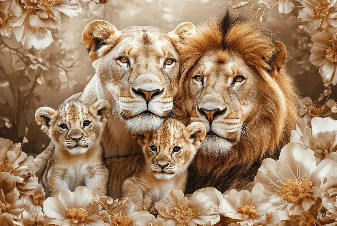 Glasschilderij 120x80cm Getekende leeuwen 2 welpjes beige