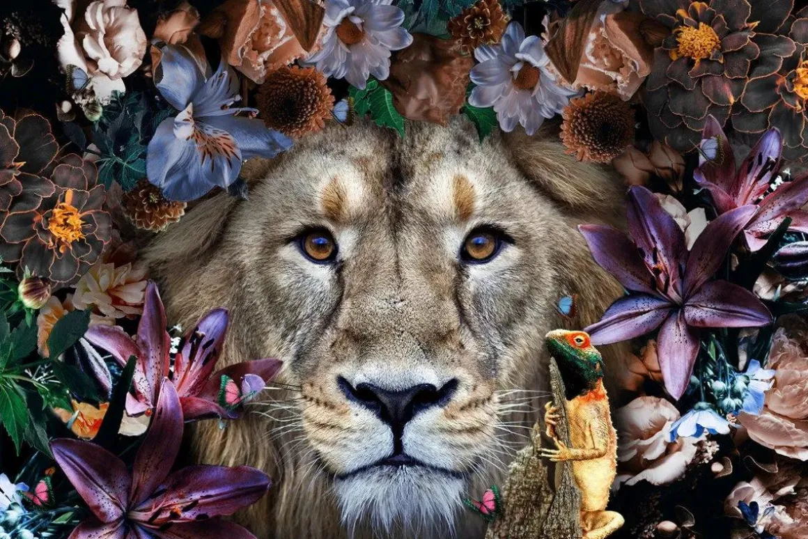 Glasschilderij 120x80cm Leeuw met bloemen midden