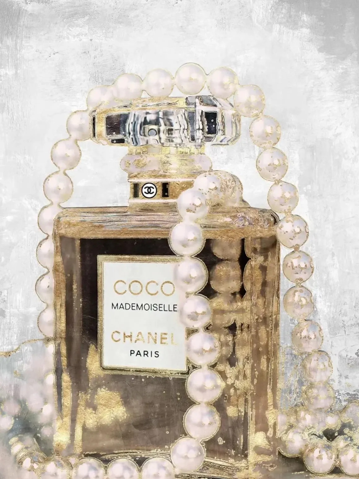 Glasschilderij met goudfolie parfumfles met parels 60x80cm