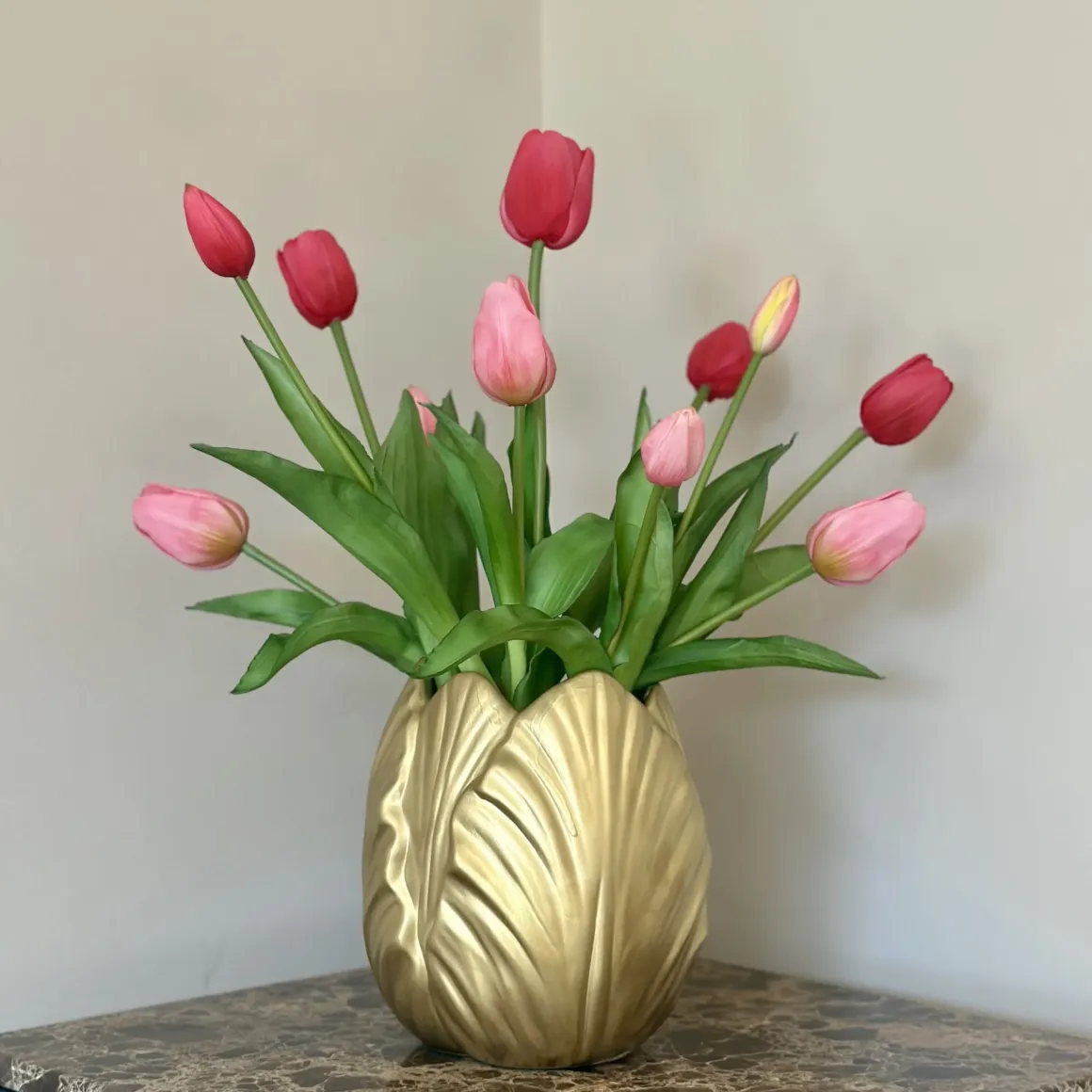 Wij hebben een prachtige tulp vaas met roze zijden tulpen boeket opgemaakt. Wekelijks maken wij nieuwe opgemaakte vazen. Handig als je opzoek bent naar een vaas met zijden bloemen.