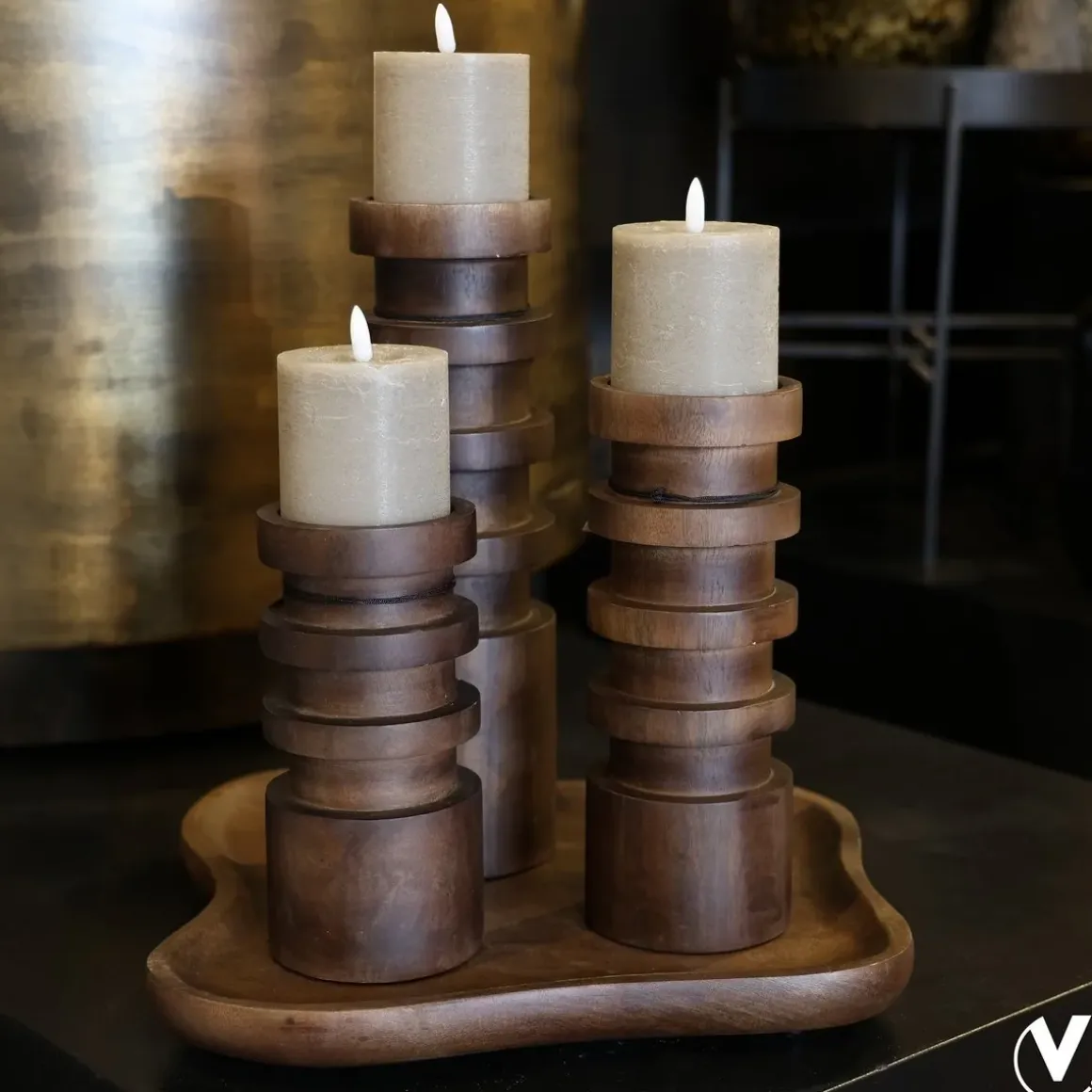 Wat meteen opvalt is de rijke houtstructuur en de elegante rondingen. Dankzij de royale diameter van 35 cm biedt dit dienblad voldoende ruimte voor een mooie opstelling van bijvoorbeeld kaarsen, een paar stijlvolle glaasjes of decoratieve elementen. Het is de perfecte manier om met laagjes en materialen te spelen combineer het bijvoorbeeld met het glaswerk van Vase The World voor een trendy mix van structuren.