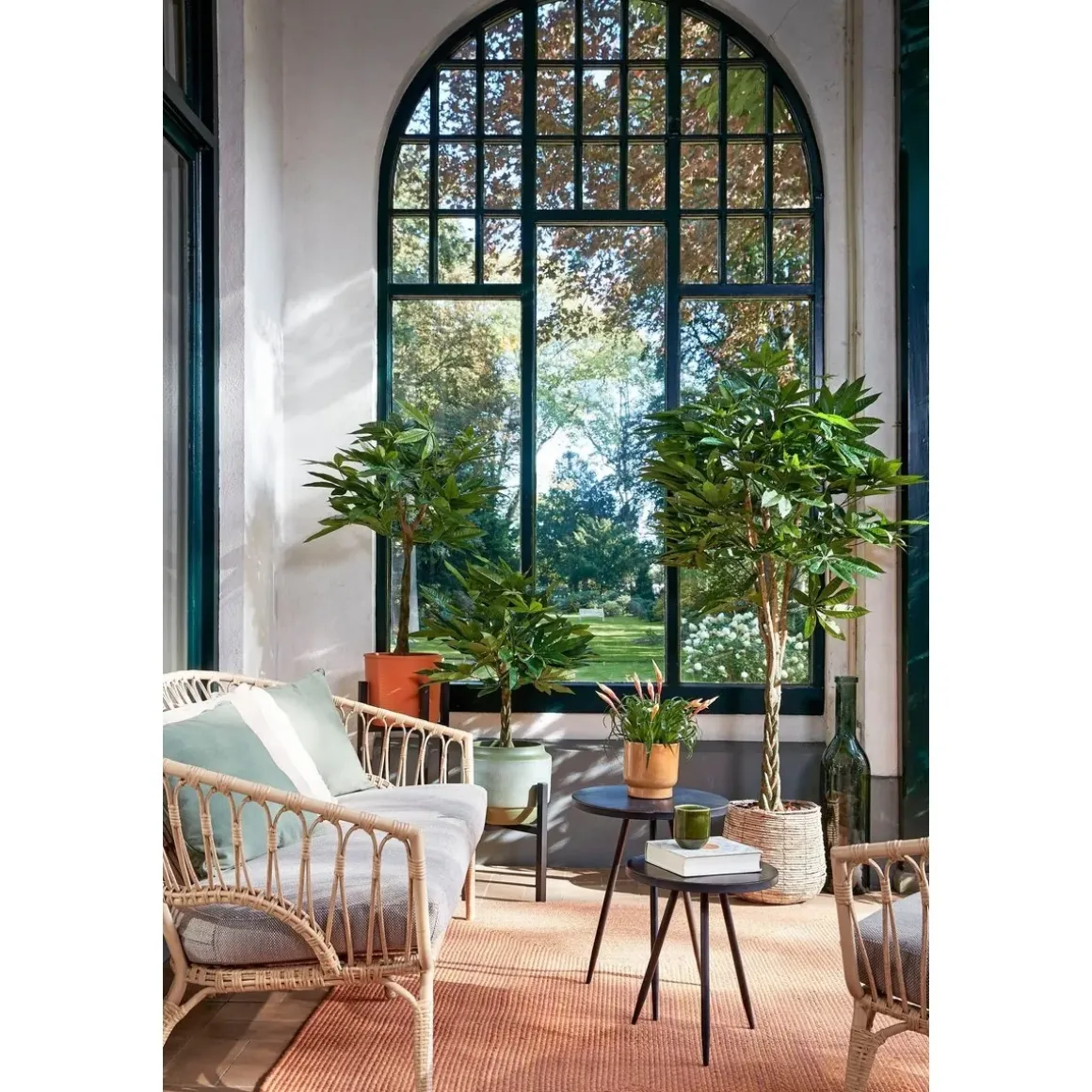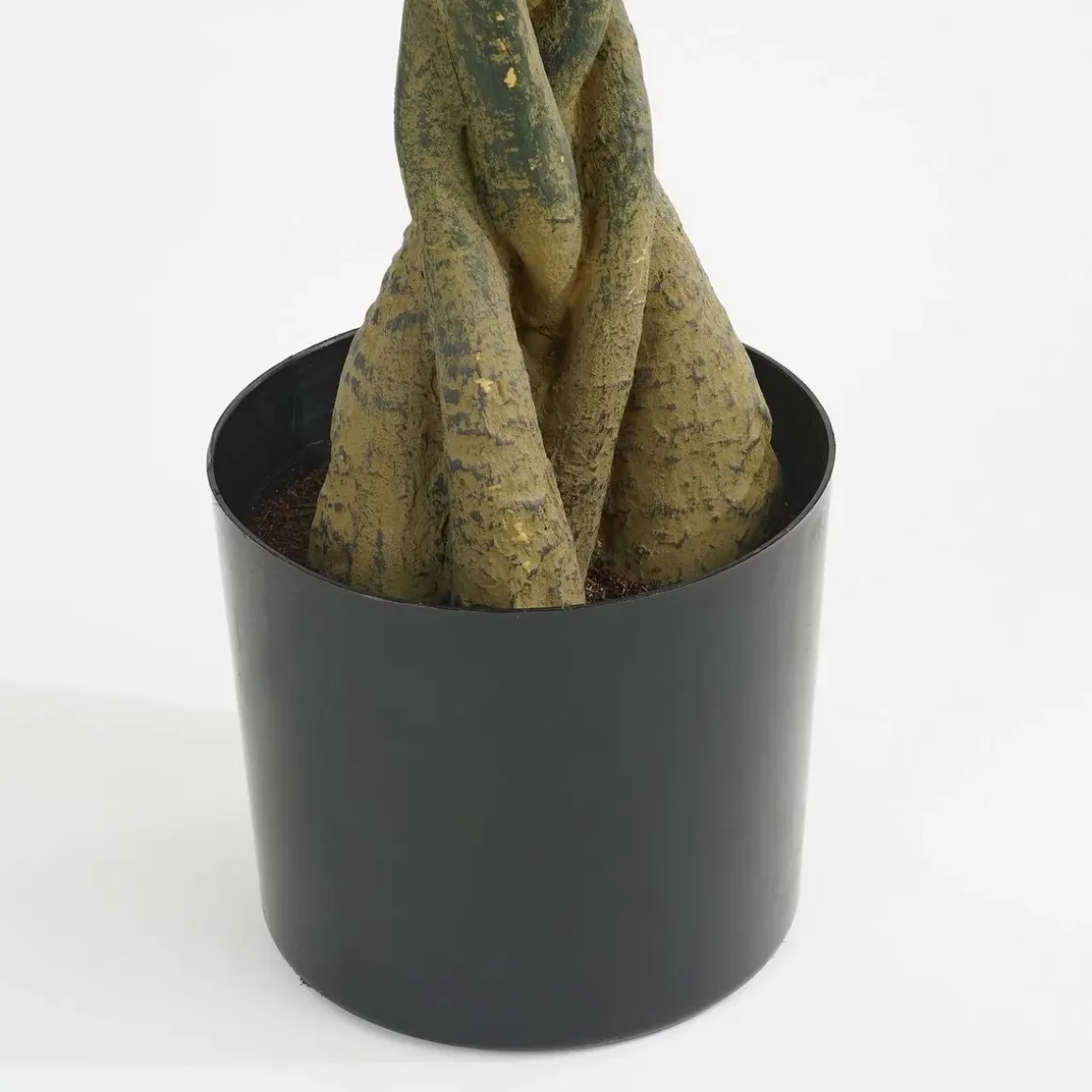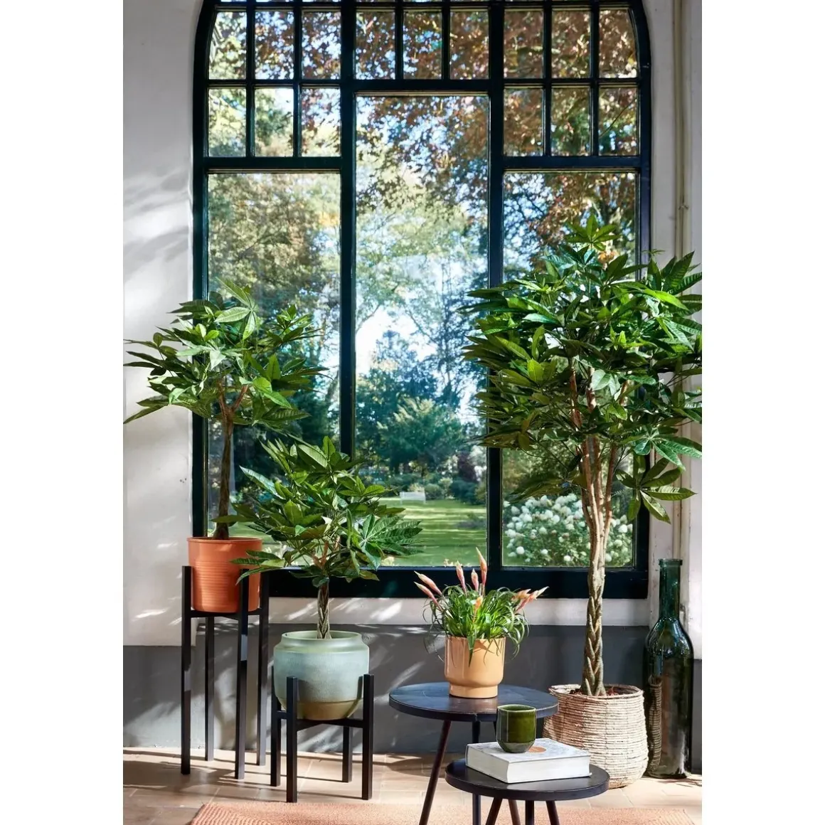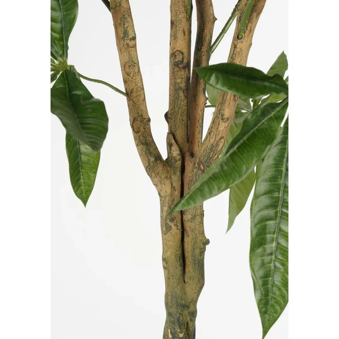 Klaar om zorgeloos te genieten? De kunstplanten voor binnen van Mica Decorations zijn niet van echt te onderscheiden, maar hebben geen enkel onderhoud nodig. De Pachira, ook wel Watercacoa of Geldboom genoemd, staat in het Verre Oosten symbool voor welvaart en geluk wordt vaak als cadeau gegeven. Deze kunstvariant is een leuk alternatief, bijvoorbeeld voor iemand zonder groene vingers. De groene bladeren zijn uitgevoerd in verschillende maten en groentinten. Net echt! Daarnaast is de gevlochten stam gemaakt van echt hout. De plant staat in een zwarte, kunststof pot die gemakkelijk in een sierlijke bloempot gezet kan worden. Voor gebruik moet de plant nog in model worden gebracht. De afmetingen zijn ca. H120 x Ø50 cm.