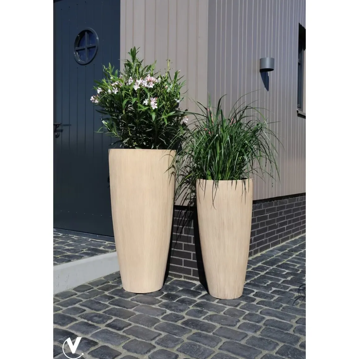 Maak een statement in stijl met de crèmekleurige fiberstone hoge bak van Vase The World, verfraaid met elegante strepen. Deze opvallende plantenbak combineert functionaliteit met een verfijnde esthetiek, waardoor het een perfecte aanvulling is voor zowel binnen- als buitengebruik.