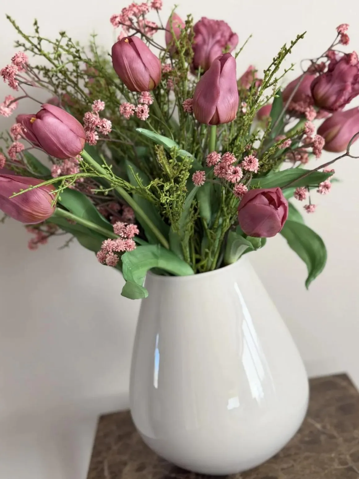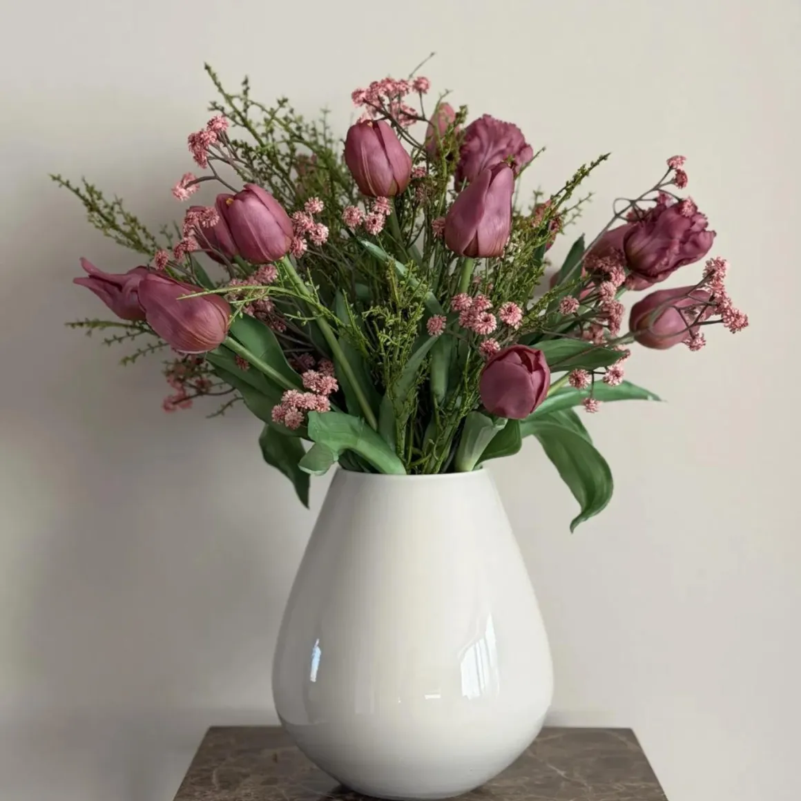 Plaats dit aubergine tulpen boeket in de Tasman vaas S voor een elegant en harmonieus geheel. Combineer met accessoires in zachte natuurtinten of juist met donkere accenten voor extra contrast. Ook prachtig als blikvanger in een open vakkenkast of op een ruime eettafel.