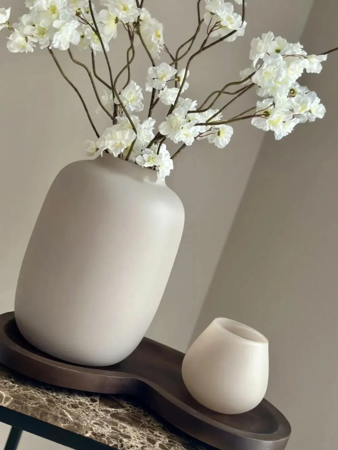 Houd je van natuurlijke kleuren, rustige vormen en minimalistische luxe? Dan is deze tafeldecoratie set in Japandi-stijlecht iets voor jou. De combinatie van warme houttinten, een matte vaas en witte bloesemtakken geeft je interieur direct een kalme, stijlvolle sfeer.