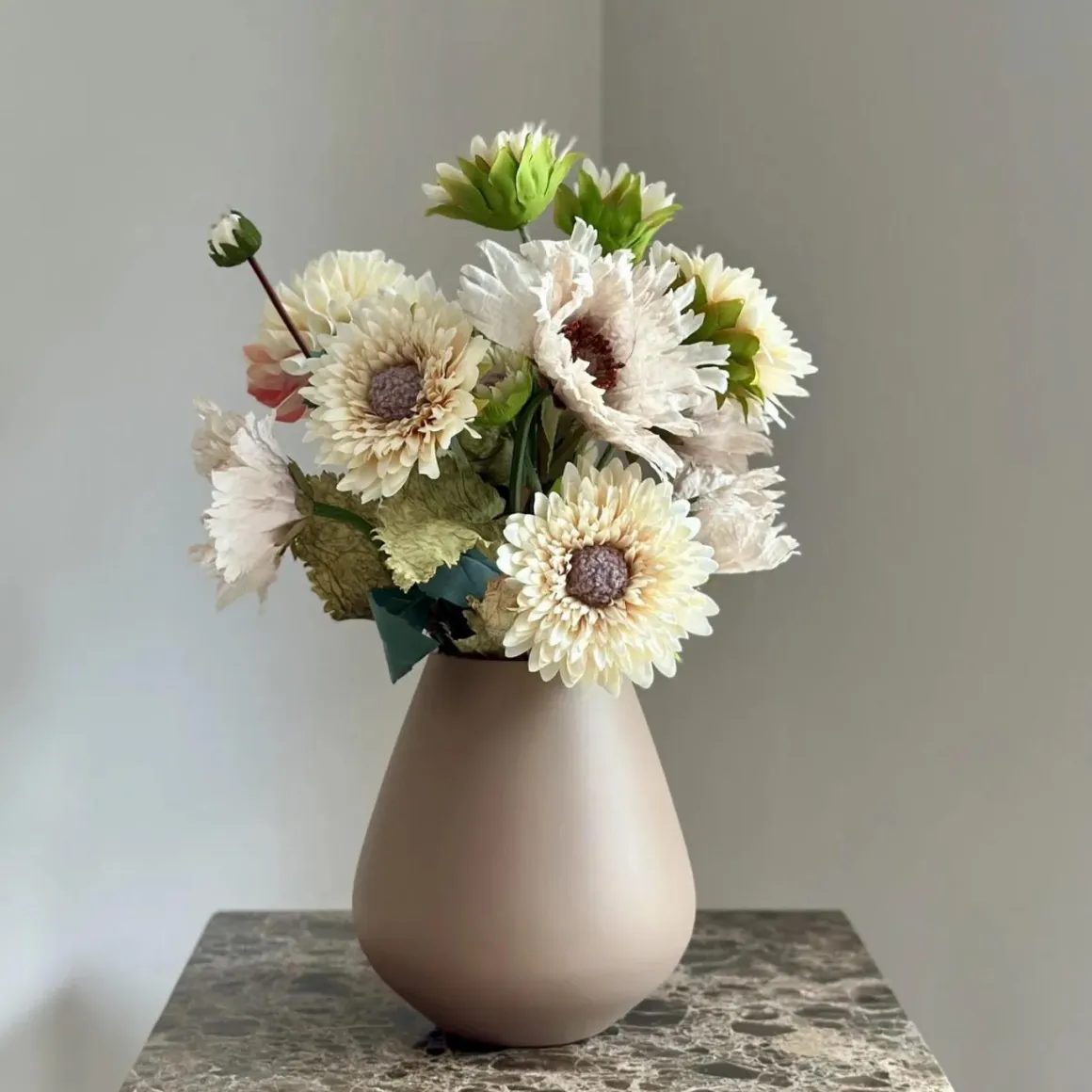 De handgemaakte taupe vaas heeft een matte finish en een natuurlijke vormgeving die moeiteloos past in een modern, minimalistisch of warm interieur. Het bijpassende boeket met beige bloemen is volledig op kleur afgestemd voor een harmonieus geheel dat rust en elegantie uitstraalt.