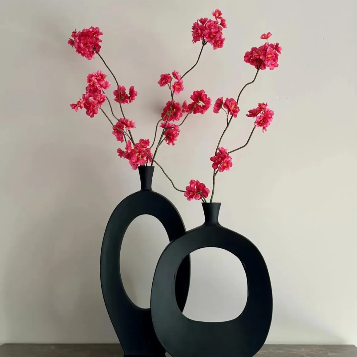 Wil je jouw vensterbank een stijlvolle upgrade geven met een vleugje kleur? Deze vensterbank decoratieset met zwarte vaas en opvallende fuchsia zijden bloesemtakken is een echte eyecatcher. De combinatie van het strakke zwarte design en de speelse bloesems zorgt voor een luxe, vrolijke sfeer zonder dat het te druk wordt.