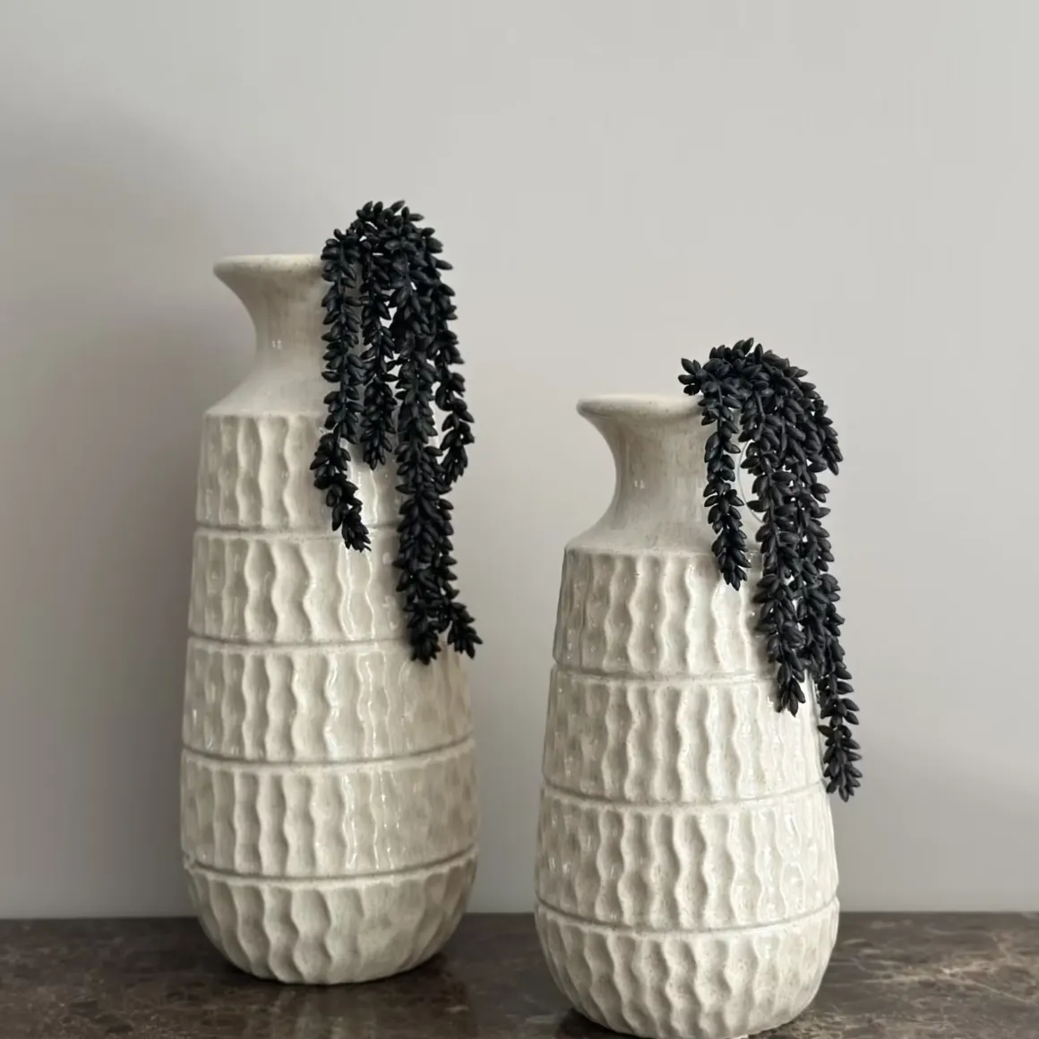 De zwarte plantjes zorgen voor een krachtig contrast met het zachte beige van de vazen. Perfect voor wie houdt van een decoratie met karakter, maar toch rust en elegantie wil uitstralen.